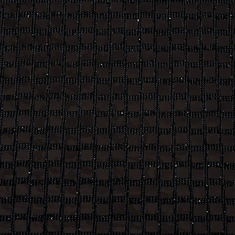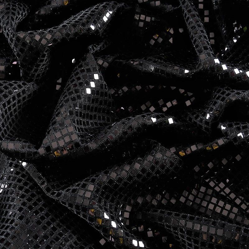 Трикотажное черное полотно с блестящими глянцевыми черными квадратными пайетками. Декор накатан на основу, поэтому будет комфортен в носке. Ткань пластичная, прекрасно драпируется и укладывается в складки, легко садится по фигуре за счёт основы с эластаном, не прозрачная, позволит шить изделия без подклада. Идеально подойдет для пошива нарядных вечерних образов: платья, юбки, топа, туники, широких брюк, жакета, кардигана.