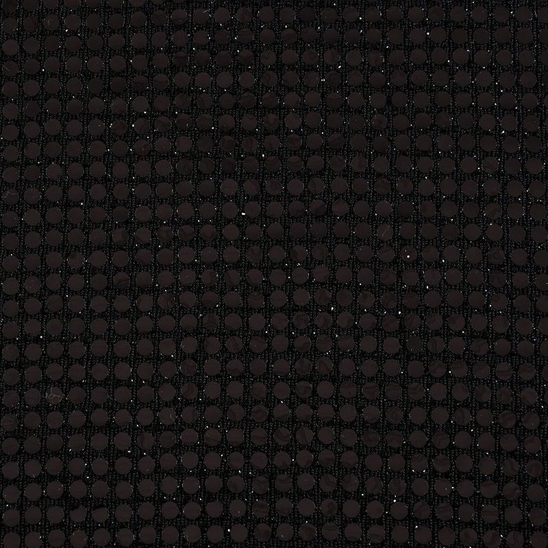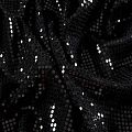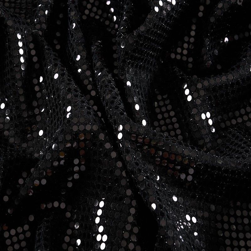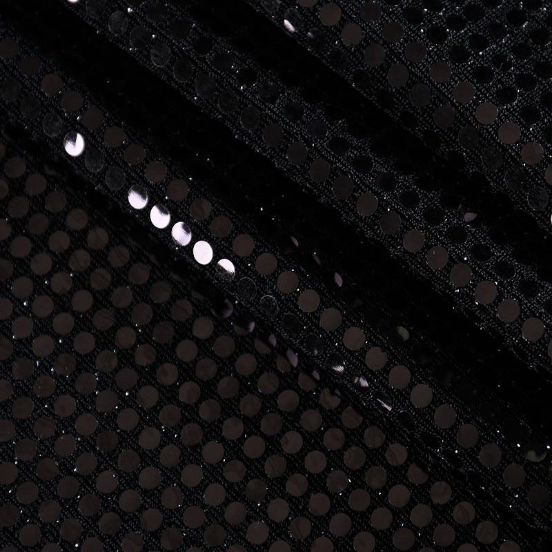 Трикотажное черное полотно с блестящими глянцевыми черными круглыми пайетками. Декор накатан на основу, поэтому будет комфортен в носке. Ткань пластичная, прекрасно драпируется и укладывается в складки, легко садится по фигуре за счёт основы с эластаном, не прозрачная, позволит шить изделия без подклада. Идеально подойдет для пошива нарядных вечерних образов: платья, юбки, топа, туники, широких брюк, жакета, кардигана.
