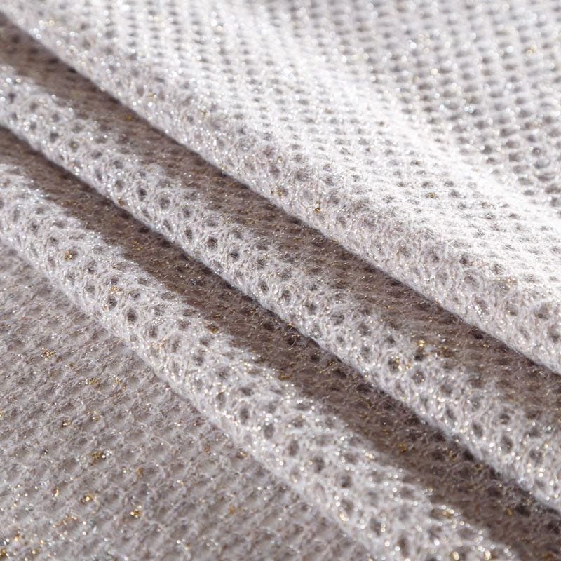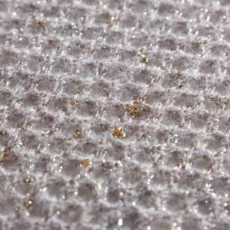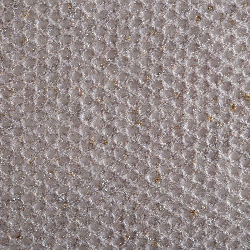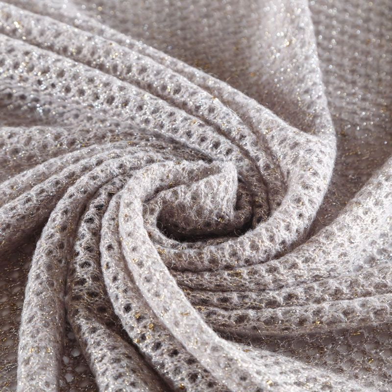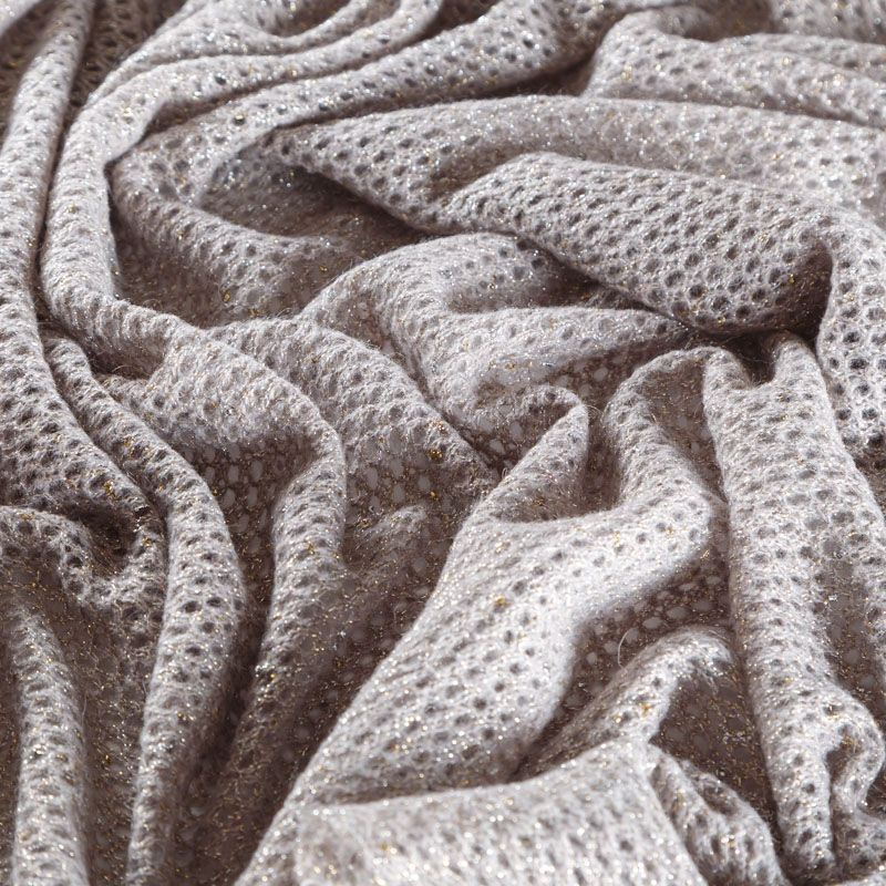 Итальянский воздушный ажурный вязаный полушерстяной трикотаж серого цвета с добавлением "нарядной" золотистой люрексной нити. Полотно легкое, мягкое, не колется, прозрачное. Идеально подойдет для пошива водолазки, джемпера, свитера, кардигана, а также для шарфа, снуда.