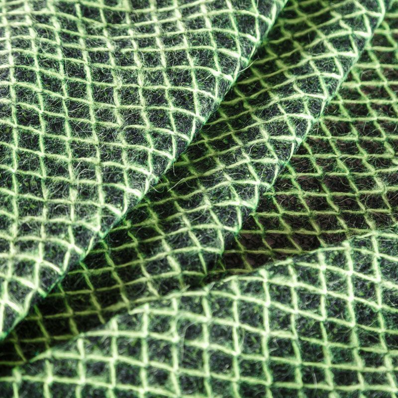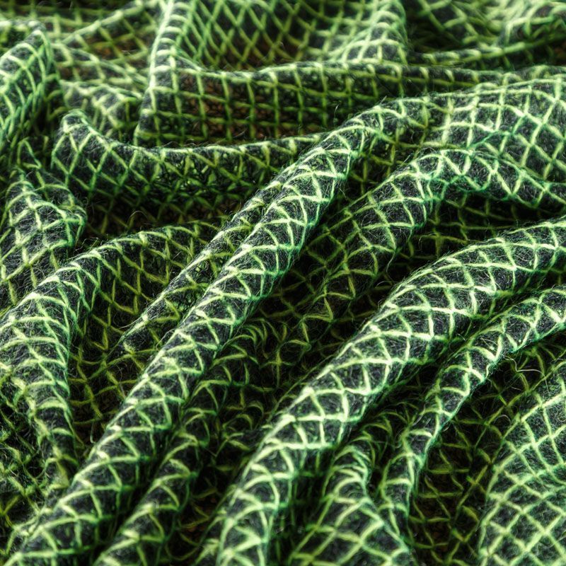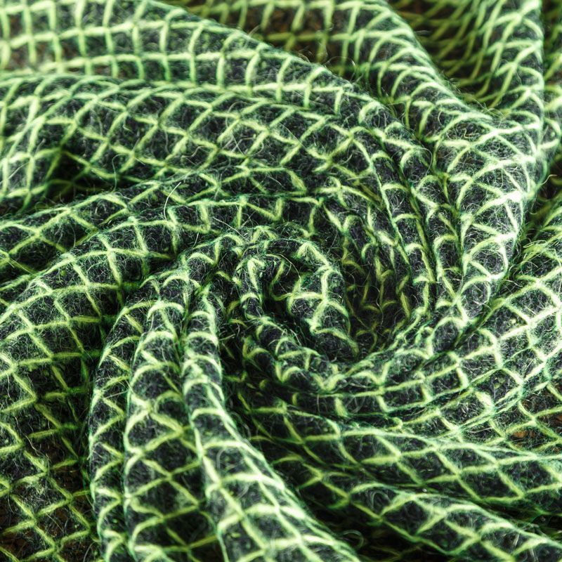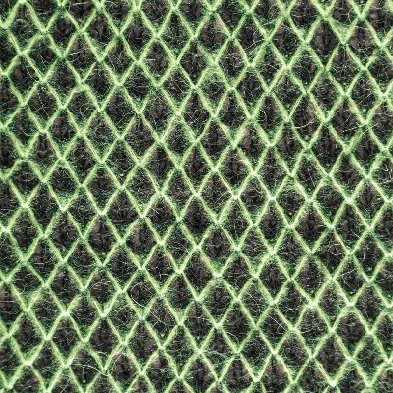Итальянский шерстяной ажурный вязаный трикотаж черного цвета декорирован яркой зеленой нитью, которая имитирует сетку. Полотно очень легкое, мягкое, воздушное, не колется, прозрачное за счет плетения, может потребоваться подклад. Идеально подойдет для пошива водолазки, свитера, платья, кардигана, а также для шарфа, снуда.