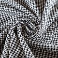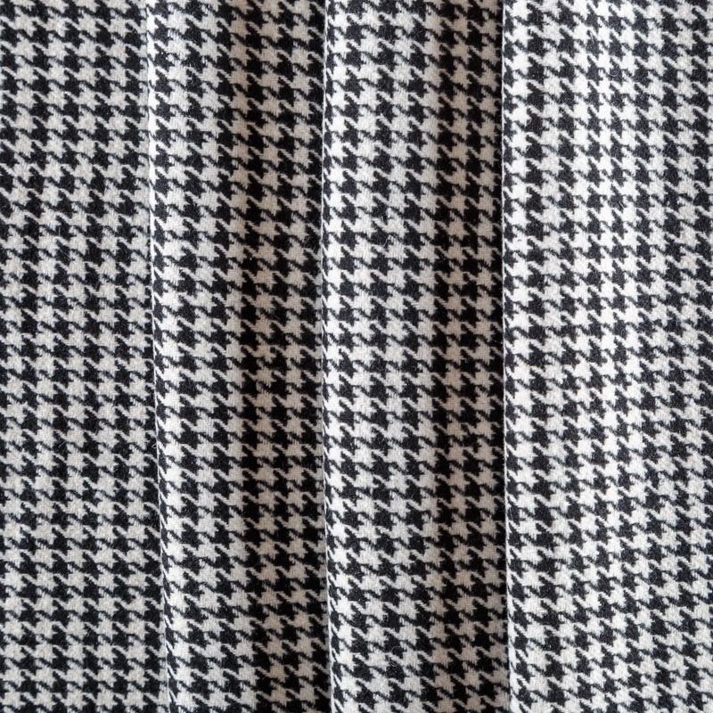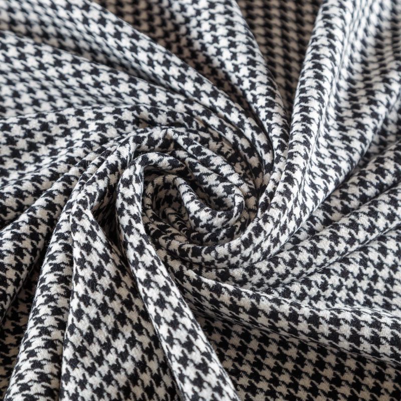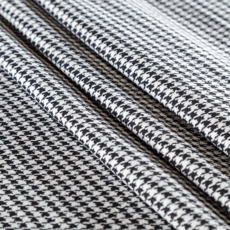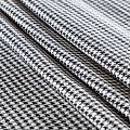 Твид белого цвета с плетеной матовой поверхностью, мелкий узор "гусиная лапка" образуется переплетением черных нитей. Ткань не сухая, мягкая, но плотная, не просвечивает, теплая, хоршо драпируется. Отлично подойдет для пошива легкой верхней одежды, жакетов, костюмов, юбок.