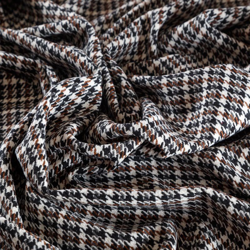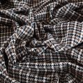 Твид молочного оттенка с плетеной матовой поверхностью, мелкий узор "гусиная лапка" образуется переплетением серых, коричневых и черных нитей. Ткань не сухая, мягкая, но плотная, не просвечивает, теплая, хоршо драпируется. Отлично подойдет для пошива легкой верхней одежды, жакетов, костюмов, юбок.