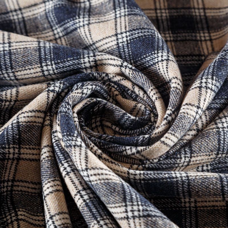 Фактурная и плотная твидовая ткань с добавлением хлопка в красивую бежево-синюю клетку. Ткань мягкая, пластичная, приятная на ощупь. Хорошо драпируется и образует формоустойчивые складки. Твид отлично подходит для пошива костюмов, пальто, пиджаков, брюк и курток, юбок, жилетов, головных уборов в классическом стиле.