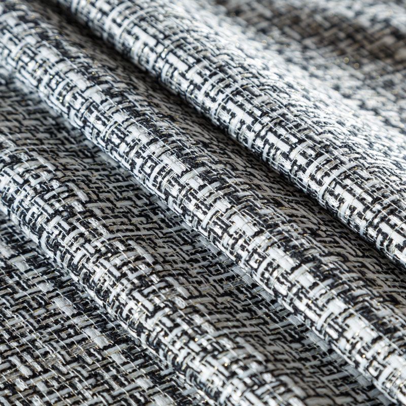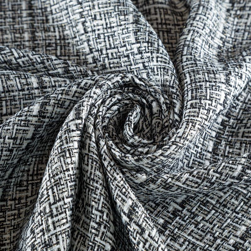 Мягкая, пластичная и объемная ткань, с разреженной и рельефной вывязанной структурой. Буклированный твид в стиле Шанель буквально соткан из различных по толщине и текстуре нитей, образующих рисунок в виде клетки. В плетение добавлена блестящая люрексная нить. Твид идеально подходит для пошива платьев, юбок, жакетов, легких пальто, эффектных бомберов и курток.