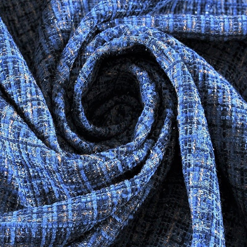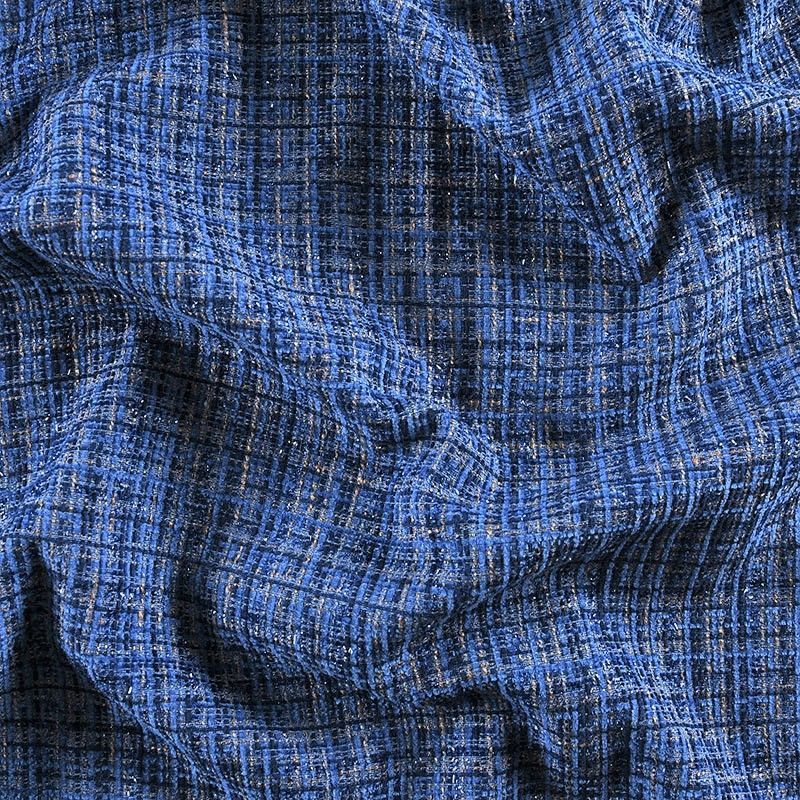 Мягкая, пластичная и объемная ткань, с разреженной и рельефной вывязанной структурой. Буклированный твид в стиле Шанель буквально соткан из различных по толщине и текстуре нитей, образующих рисунок в виде клетки. В плетение добавлена блестящая люрексная нить. Твид идеально подходит для пошива платьев, юбок, жакетов, легких пальто, эффектных бомберов и курток.