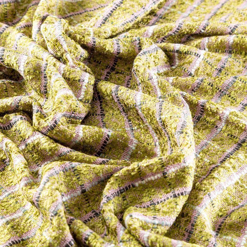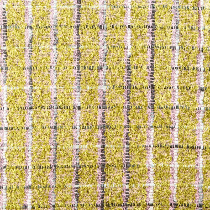 Мягкая ткань с рельефной вывязанной структурой. Буклированный твид в стиле Шанель буквально соткан из толстых цветных нитей, образующих рисунок в виде клетки. Различная толщина нитей создает эффектную фактуру. Ткань достаточно формоустойчивая, при этом пластичная, гибкая за счет плетения,  матовая, мягкая, приятная на ощупь, не рыхлая. Прекрасно подойдет для пошива жакета, юбки в виде трапеции, легкого пальто, костюма.