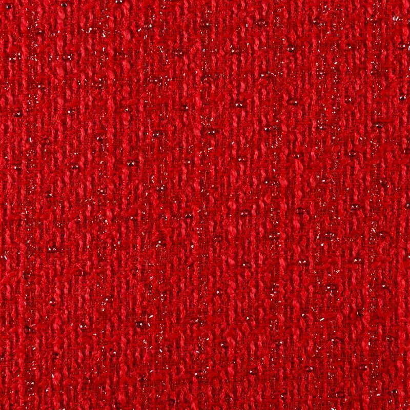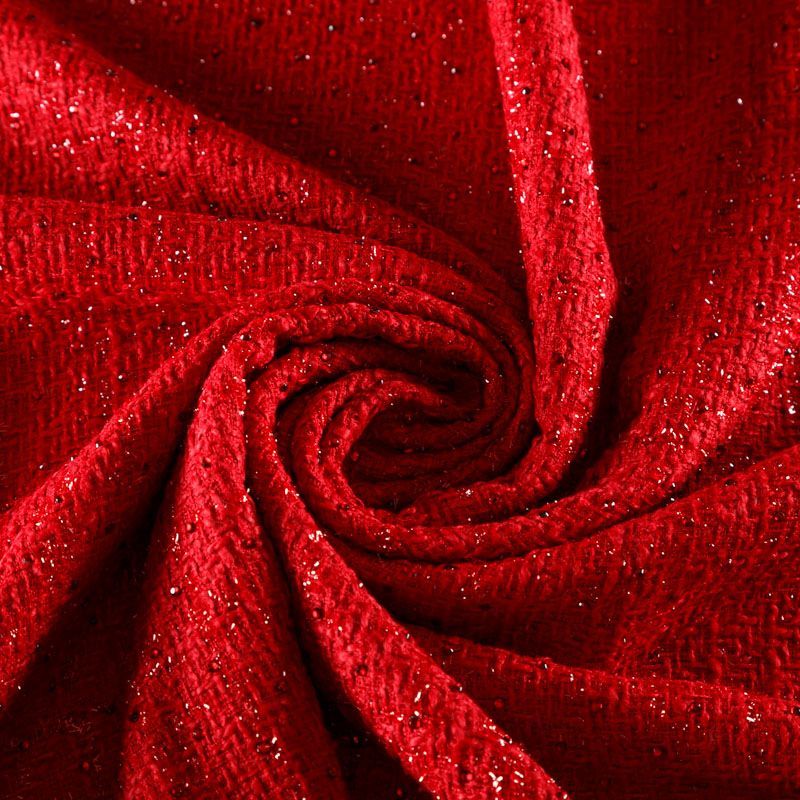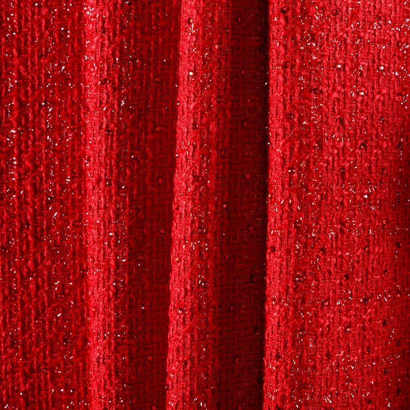 Плотный, в меру объемный твид с легким эффектом букле из нитей рубиново-красного оттенка с добавлением акцента в виде люрексовой нити и страз в цвет ткани. Твид пластичный, хорошо драпируется, умеренно держит форму, прекрасно подойдет для пошива жакетов на подкладке, жилетов, кардиганов, легких пальто, юбок и платьев.