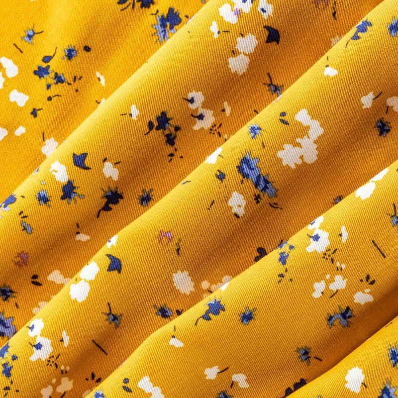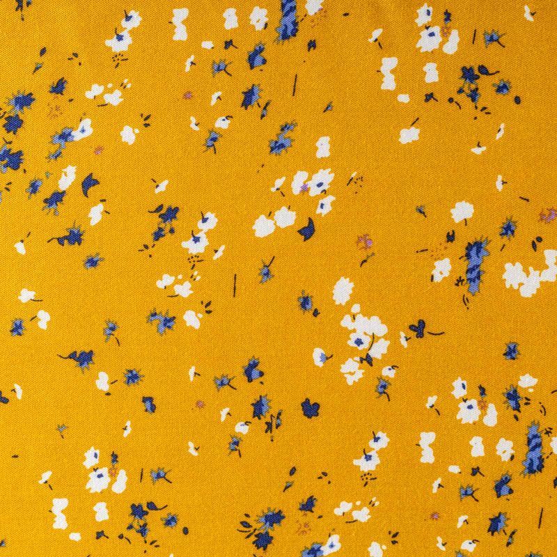 Качественный вискозный твил-штапель с нежным принтом из мелких цветочков белого и синего оттенков на фоне цвета шафрана. Мягкая ткань средней плотности, имеет саржевое плетение и характерный диагональный рубчик на поверхности. Хорошо сохраняет форму, не сильно мнется и не деформируется в процессе эксплуатации.  Красиво ложится в складки, поэтому прекрасно подойдет на длинные драпированные юбки и платья, туники, на свободные брюки или шорты, топы.