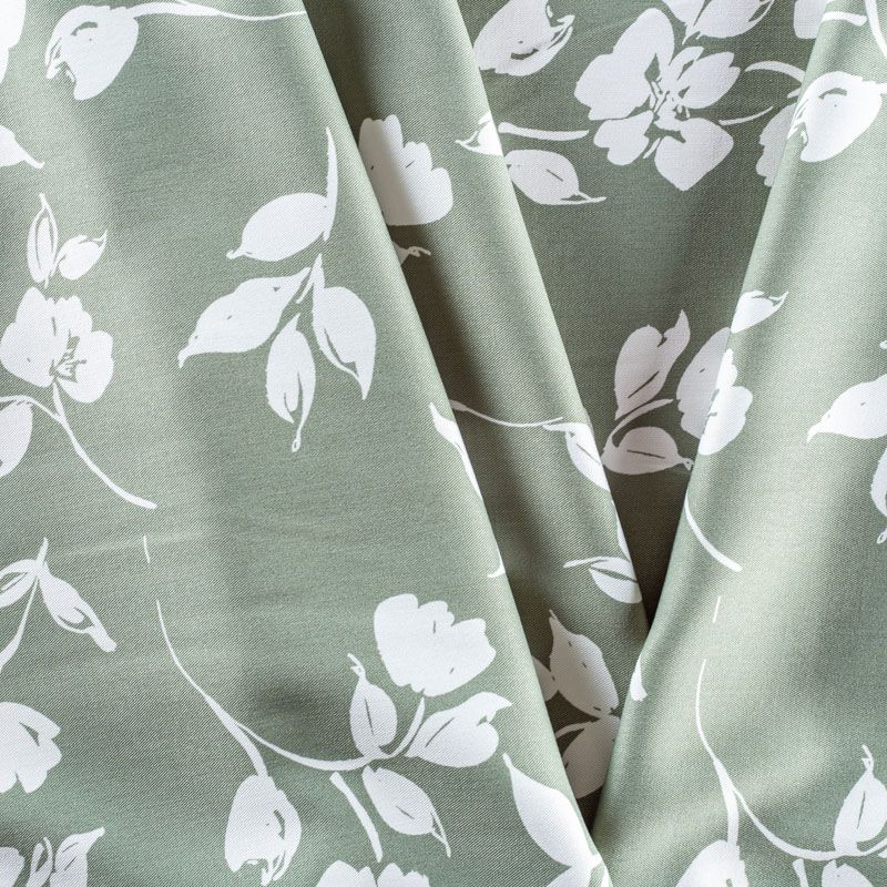 Качественный твил-штапель с белым цветочным принтом на фисташковом фоне. Мягкая ткань средней плотности, имеет саржевое плетение и характерный диагональный рубчик на поверхности. Хорошо сохраняет форму, не сильно мнется и не деформируется в процессе эксплуатации.  Красиво ложится в складки, поэтому прекрасно подойдет на длинные драпированные юбки и платья, на свободные брюки или шорты, топы.