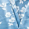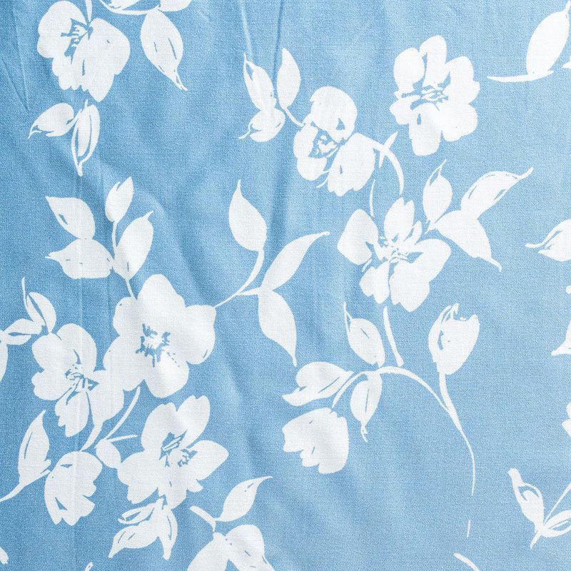 Качественный твил-штапель с белым цветочным принтом на серо-голубом фоне. Мягкая ткань средней плотности, имеет саржевое плетение и характерный диагональный рубчик на поверхности. Хорошо сохраняет форму, не сильно мнется и не деформируется в процессе эксплуатации.  Красиво ложится в складки, поэтому прекрасно подойдет на длинные драпированные юбки и платья, на свободные брюки или шорты, топы.