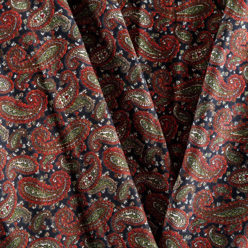 Плотная и мягкая ткань черного цвета с узором пейсли в красно-зеленых оттенках, имеет саржевое плетение и характерный диагональный рубчик на поверхности. Отлично сохраняет форму, не сильно мнется и не деформируется в процессе эксплуатации. Красиво ложится в складки, поэтому прекрасно подойдет на длинные драпированные юбки и платья, на свободные брюки или шорты, топы.