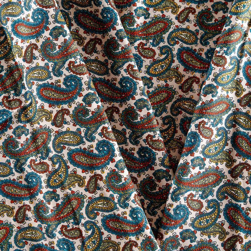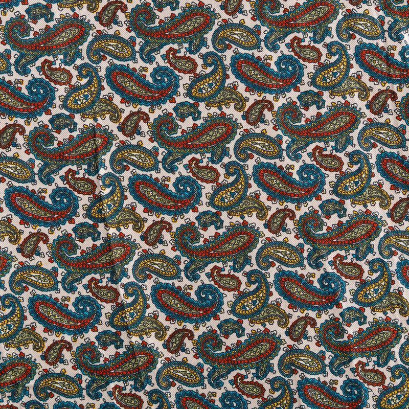 Плотная и мягкая ткань оттенка экрю с цветным узором пейсли, имеет саржевое плетение и характерный диагональный рубчик на поверхности. Отлично сохраняет форму, не сильно мнется и не деформируется в процессе эксплуатации. Красиво ложится в складки, поэтому прекрасно подойдет на длинные драпированные юбки и платья, на свободные брюки или шорты, топы.