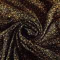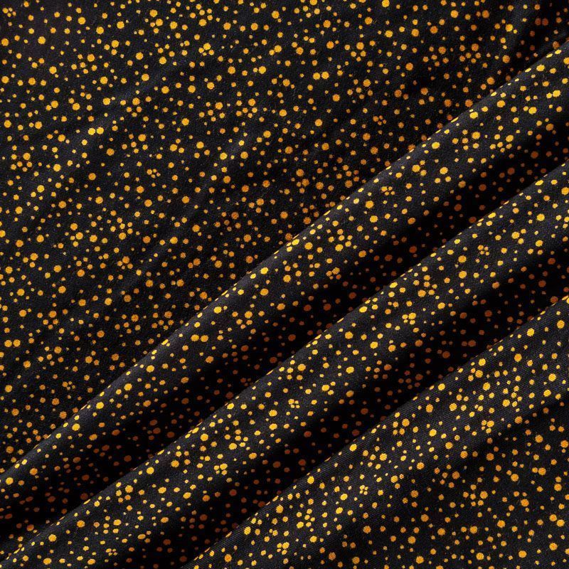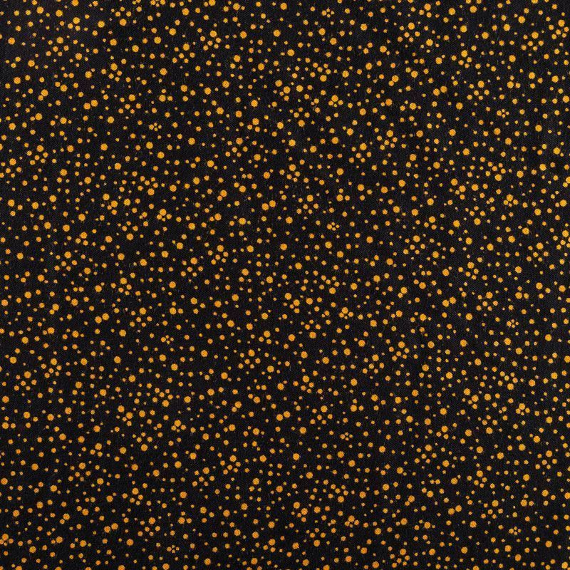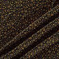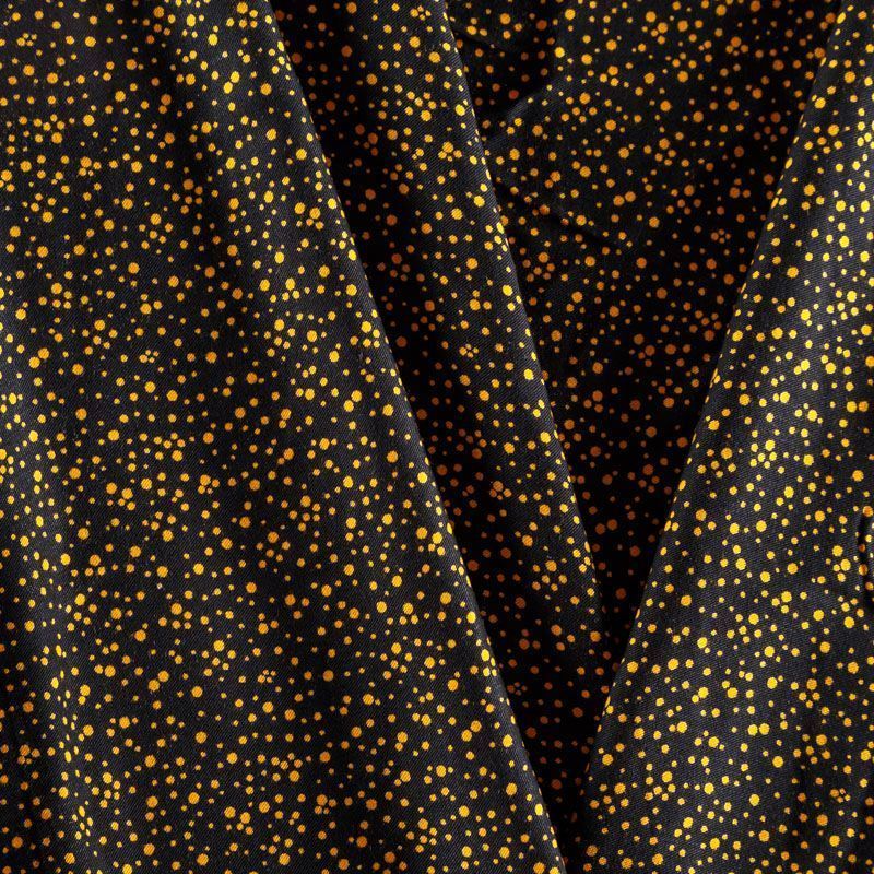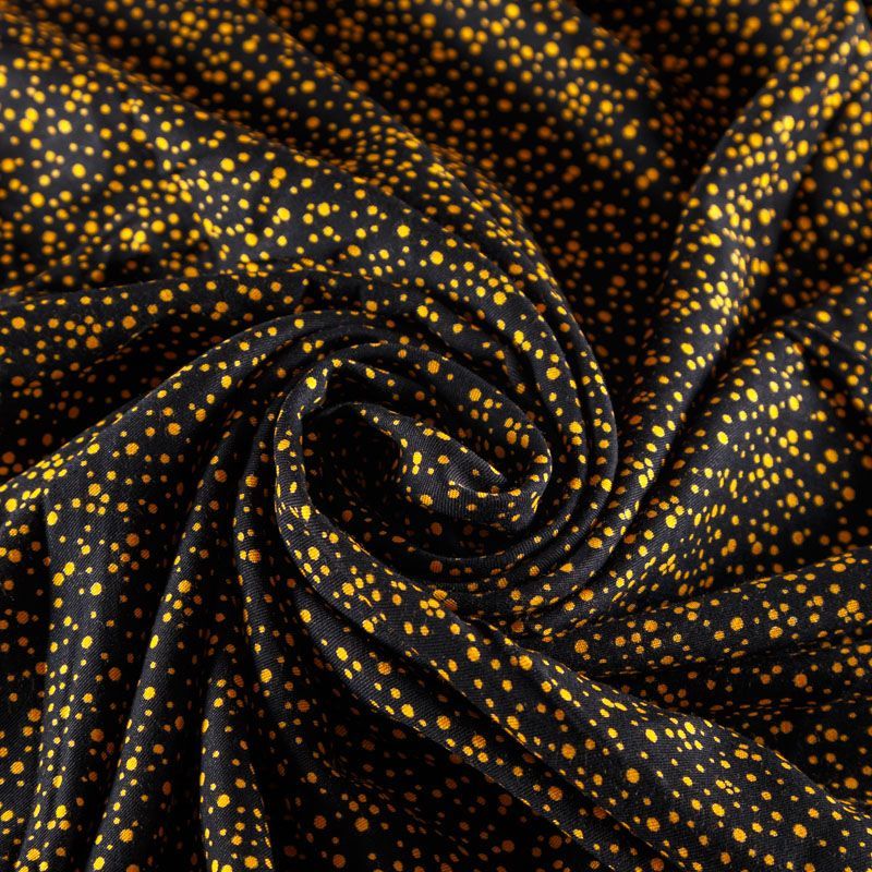 Плотная и мягкая ткань черного цвета с хаотичным мелким принтом желтого оттенка, имеет саржевое плетение и характерный диагональный рубчик на поверхности. Отлично сохраняет форму, не сильно мнется и не деформируется в процессе эксплуатации.  Красиво ложится в складки, поэтому прекрасно подойдет на длинные драпированные юбки и платья, на свободные брюки или шорты, топы.