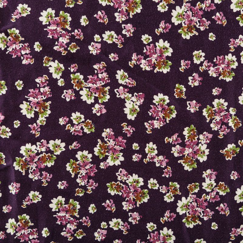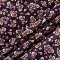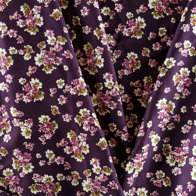 Плотная и мягкая ткань темно-сливового оттенка с ярким мелкоцветом, имеет саржевое плетение и характерный диагональный рубчик на поверхности. Отлично сохраняет форму, не сильно мнется и не деформируется в процессе эксплуатации. Красиво ложится в складки, поэтому прекрасно подойдет на длинные драпированные юбки и платья, на свободные брюки или шорты, топы.