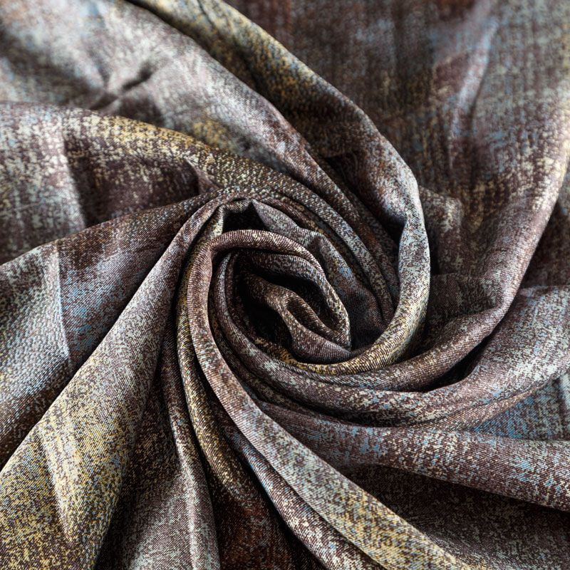 Плотная и мягкая ткань серо-голубого оттенка с абстрактным принтом, имеет саржевое плетение и характерный диагональный рубчик на поверхности. Отлично сохраняет форму, не сильно мнется и не деформируется в процессе эксплуатации. Красиво ложится в складки, поэтому прекрасно подойдет на длинные драпированные юбки и платья, на свободные брюки или шорты, топы.