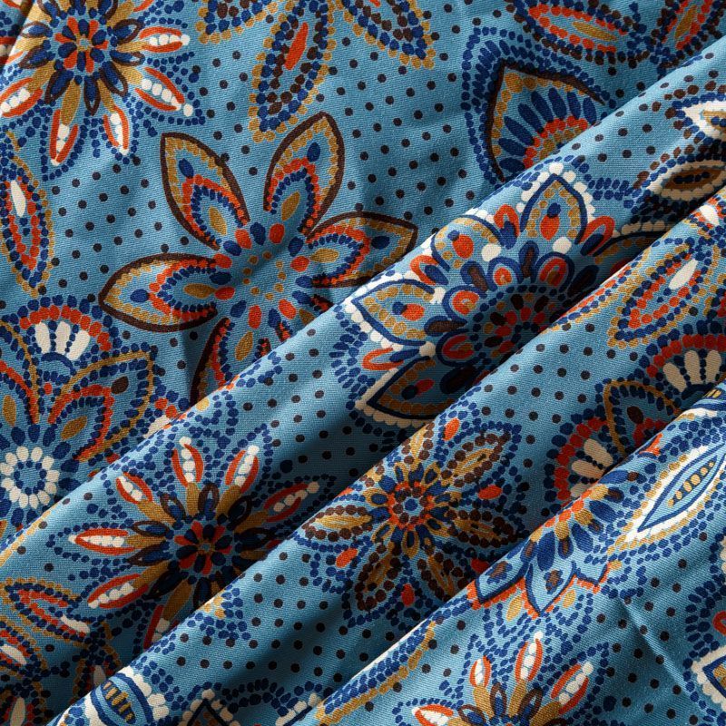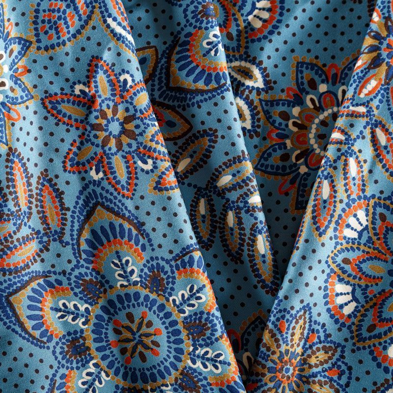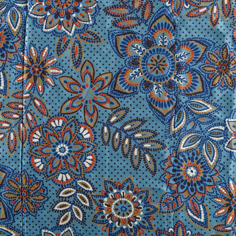 Плотная и мягкая ткань голубого оттенка со стилизованным цветочным орнаментом, имеет саржевое плетение и характерный диагональный рубчик на поверхности. Отлично сохраняет форму, не сильно мнется и не деформируется в процессе эксплуатации.  Красиво ложится в складки, поэтому прекрасно подойдет на длинные драпированные юбки и платья, на свободные брюки или шорты, топы.