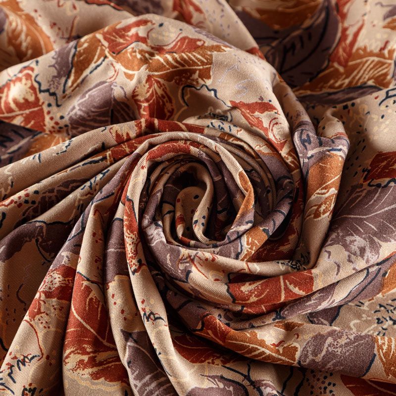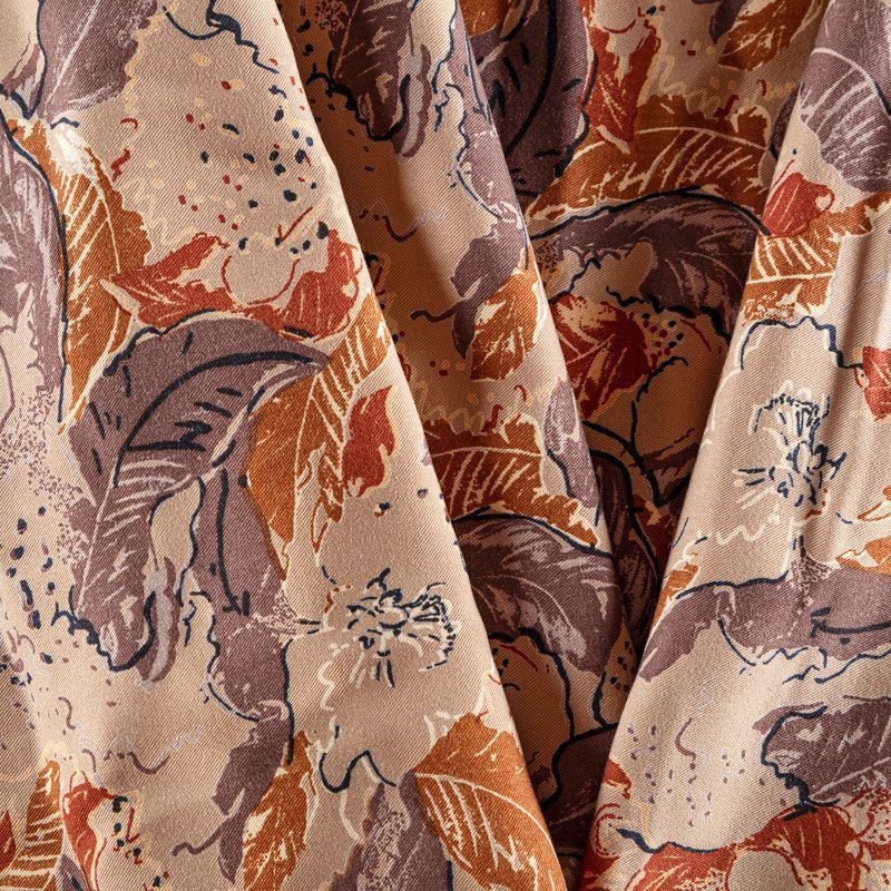 Плотная и мягкая ткань бежевого цвета с растительным принтом в осенних оттенках, имеет саржевое плетение и характерный диагональный рубчик на поверхности. Отлично сохраняет форму, не сильно мнется и не деформируется в процессе эксплуатации. Красиво ложится в складки, поэтому прекрасно подойдет на длинные драпированные юбки и платья, на свободные брюки или шорты, топы, комбинезоны, а также для домашней одежды.