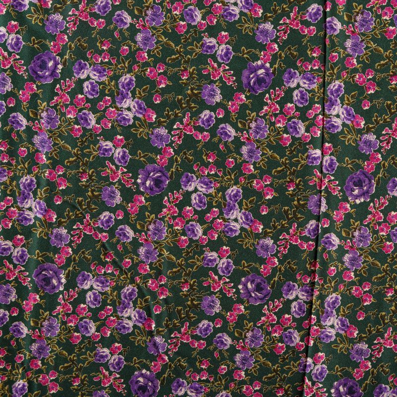 Плотная и мягкая ткань темно-зеленого цвета с ярким цветочным принтом в розово-фиолетовых оттенках, имеет саржевое плетение и характерный диагональный рубчик на поверхности. Отлично сохраняет форму, не сильно мнется и не деформируется в процессе эксплуатации. Красиво ложится в складки, поэтому прекрасно подойдет на длинные драпированные юбки и платья, на свободные брюки или шорты, топы, комбинезоны, а также для домашней одежды.