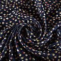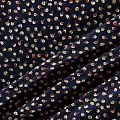 Плотная и мягкая ткань темно-синего оттенка с ярким мелкоцветом, имеет саржевое плетение и характерный диагональный рубчик на поверхности. Отлично сохраняет форму, не сильно мнется и не деформируется в процессе эксплуатации. Красиво ложится в складки, поэтому прекрасно подойдет на длинные драпированные юбки и платья, на свободные брюки или шорты, топы, комбинезоны, а также для домашней одежды.
