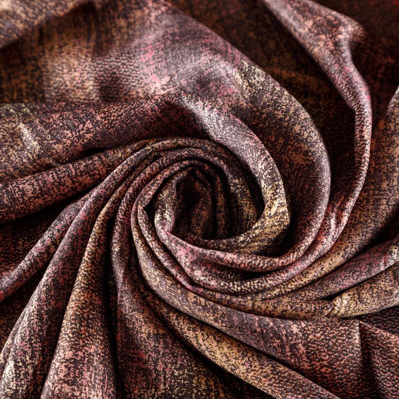 Плотная и мягкая ткань сложного оттенка с абстрактным принтом, имеет саржевое плетение и характерный диагональный рубчик на поверхности. Отлично сохраняет форму, не сильно мнется и не деформируется в процессе эксплуатации. Красиво ложится в складки, поэтому прекрасно подойдет на длинные драпированные юбки и платья, на свободные брюки или шорты, топы, комбинезоны, а также для домашней одежды.