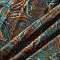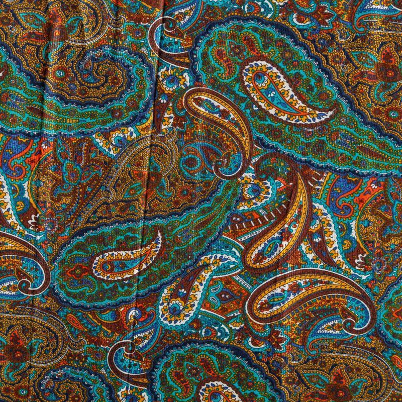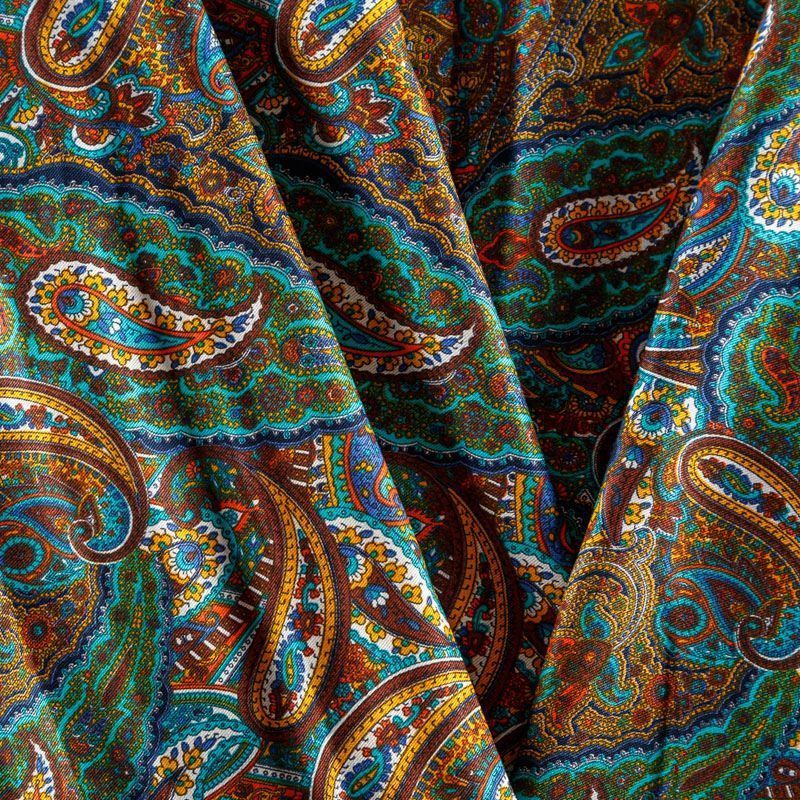 Плотная и мягкая ткань шоколадного оттенка с богатым узором пейсли в желто-синих тонах, имеет саржевое плетение и характерный диагональный рубчик на поверхности. Отлично сохраняет форму, не сильно мнется и не деформируется в процессе эксплуатации. Красиво ложится в складки, поэтому прекрасно подойдет на длинные драпированные юбки и платья, на свободные брюки или шорты, топы, комбинезоны, а также для домашней одежды.