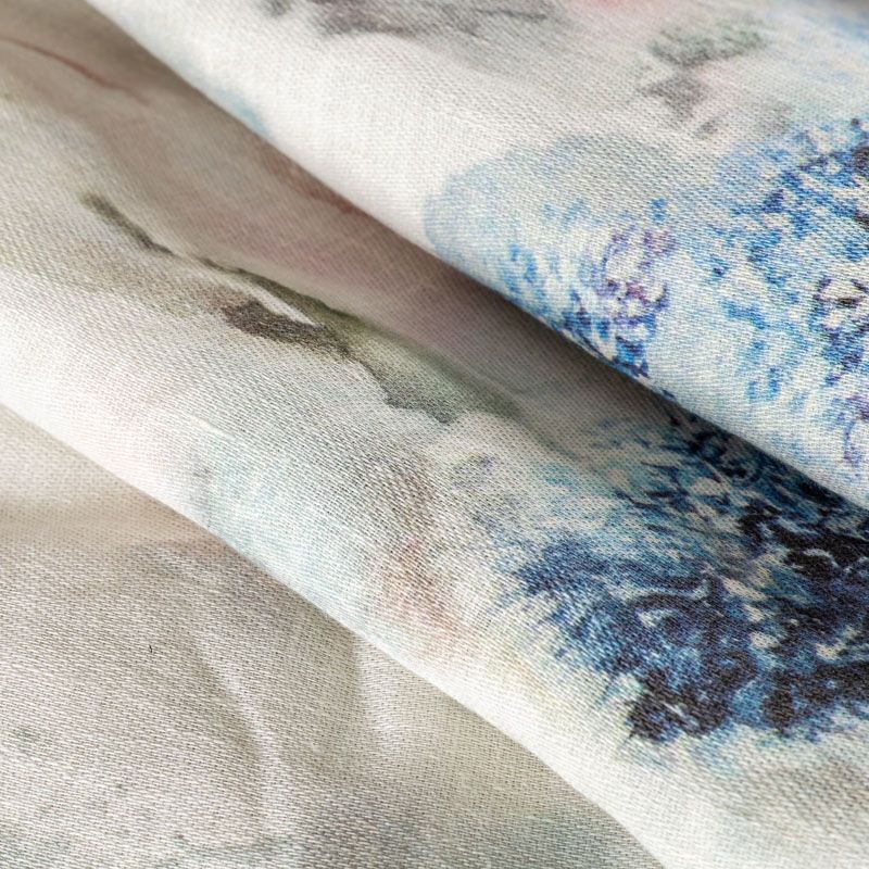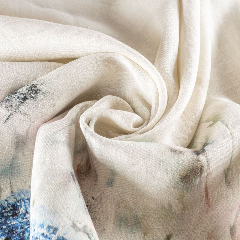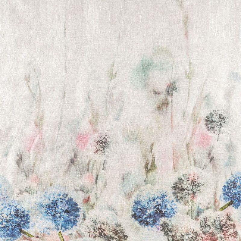 Ткань изготовлена изо льна методом полотняного переплетения. Она прочная, достаточно плотная,  держит форму и обладает ярко выраженной фактурой. Эта ткань подойдет для пошива штор, римских штор, предметов столового белья. Её можно использовать для декора интерьера загородного дома или веранды. На расстоянии 1 м от низа тюля расположен принтованный акварельный рисунок в сине-розовых оттенках.