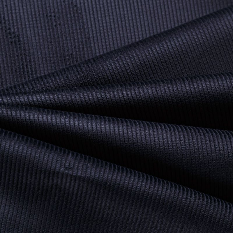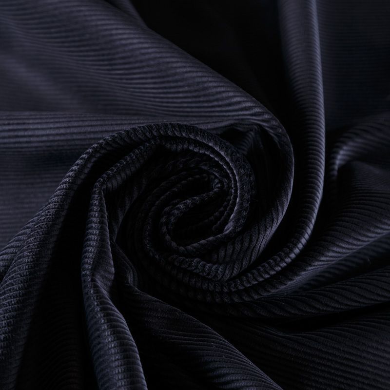 Итальянский костюмно-плательный вельвет из хлопка в черном оттенке. Очень приятный тактильно, поверхность бархатистая, рубчик средней ширины, не тянется, не просвечивает. Подойдет для пошива костюма, платья, юбки, брюк, верхней одежды.