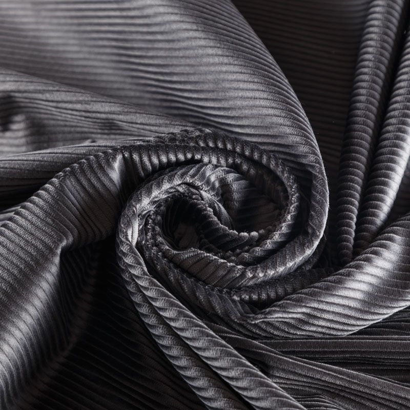 Итальянский хлопковый вельвет костюмно-плательной плотности темно-серого оттенка. Ткань имеет матовую фактурную поверхность в рубчик средней ширины, ворс короткий, мягкий и приятный на ощупь. Тянется за счет эластана в составе, хорошо драпируется и держит форму. Прекрасный вариант для пошива костюма, юбки, широких брюк, шорт, комбинезона, жакета, куртки или тренча.