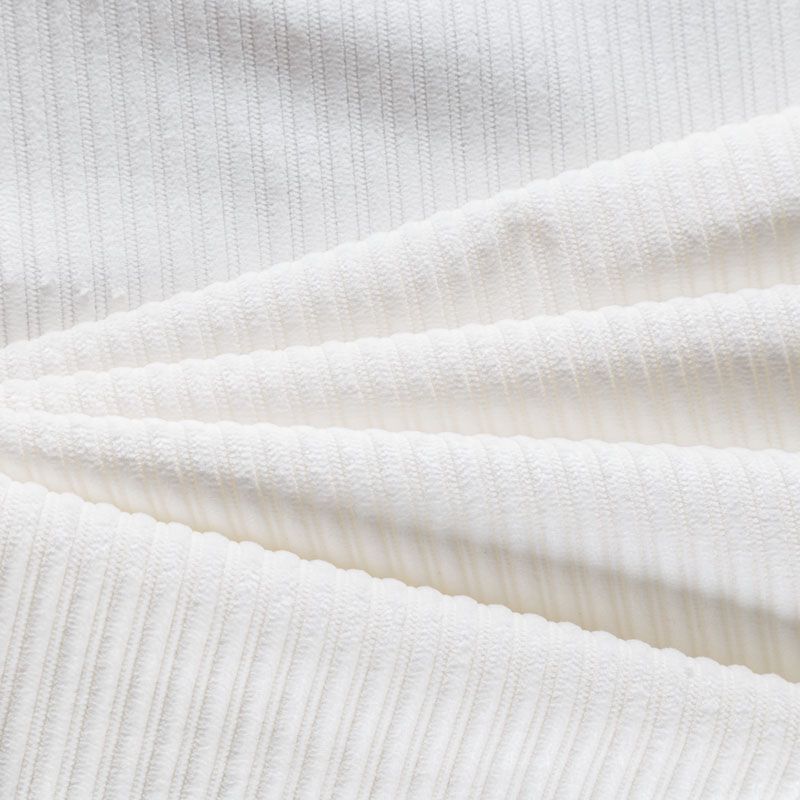 Итальянский костюмно-плательный вельвет из хлопка в молочном цвете. Очень приятный тактильно, поверхность бархатистая в широкий мягкий рубчик, немного тянется за счет эластана в составе, не просвечивает. Подойдет для пошива костюма, жакета, платья, сарафана, юбки или брюк.