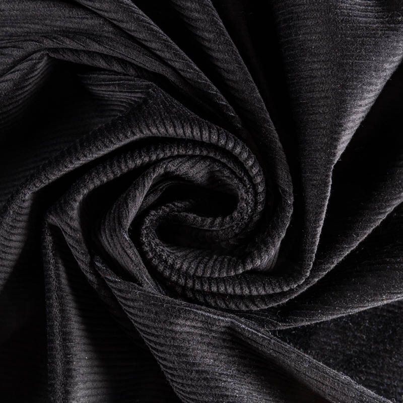 Итальянский костюмно-плательный вельвет из хлопка в черном цвете. Очень приятный тактильно, поверхность бархатистая в тонкий рубчик, немного тянется, не просвечивает. Подойдет для пошива костюма, жакета, платья, сарафана, юбки или брюк.