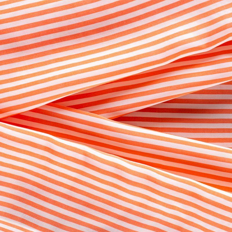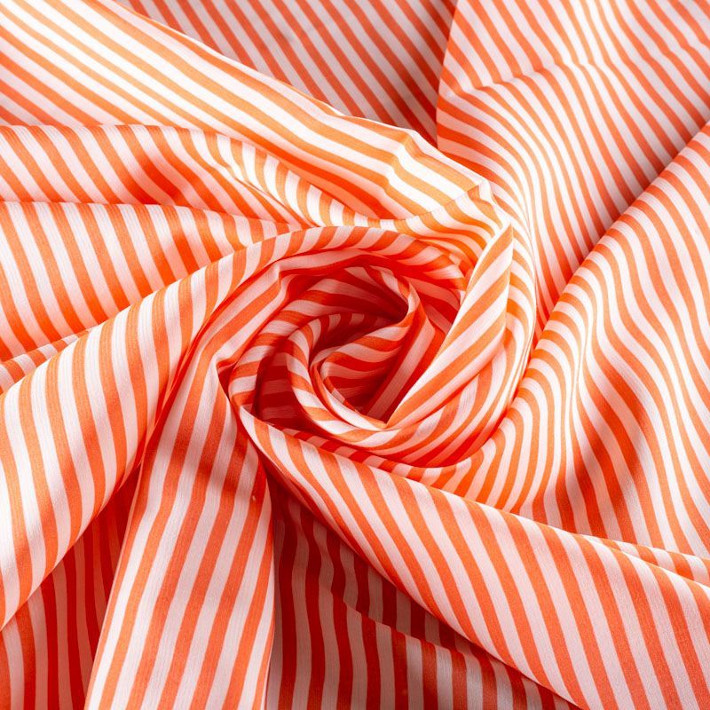 Плательно-рубашечная итальянская вискоза с принтом в горизонтальную полоску оранжевого цвета. Натуральная, дышащая ткань, очень приятная к телу, отлично драпируется, струится, не просвечивает. Хорошо подойдет для пошива платьев, рубашек, платьев-рубашек, блуз, юбок, брюк, летних костюмов, пыльников, детской одежды.