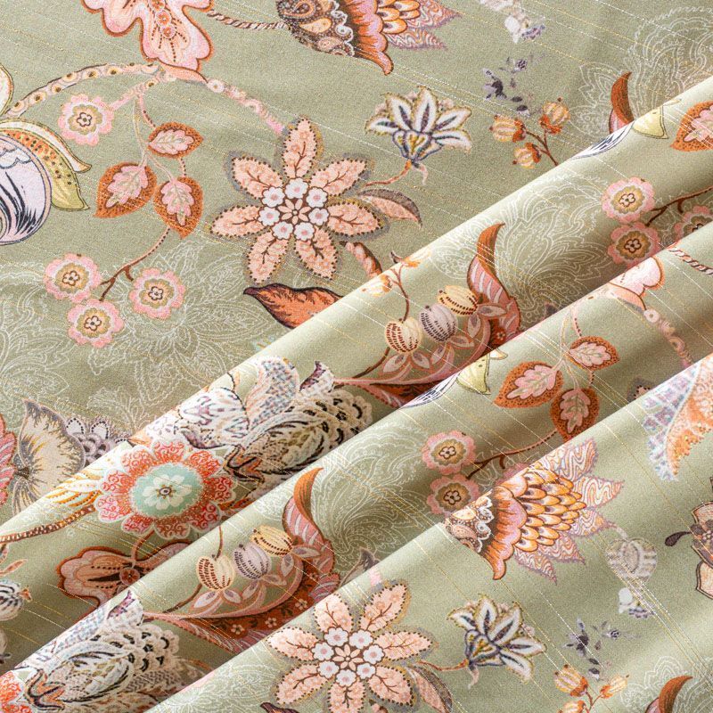 Итальянская плательно-блузочная вискоза с фантазийным цветочным принтом на фоне цвета шалфея декорирована тонкой люрексовой полоской. Ткань очень пластичная, отлично драпируется и струится, мягкая и приятная на ощупь, не просвечивает. Прекрасно подойдет для пошива платья, топа, блузки, юбки.