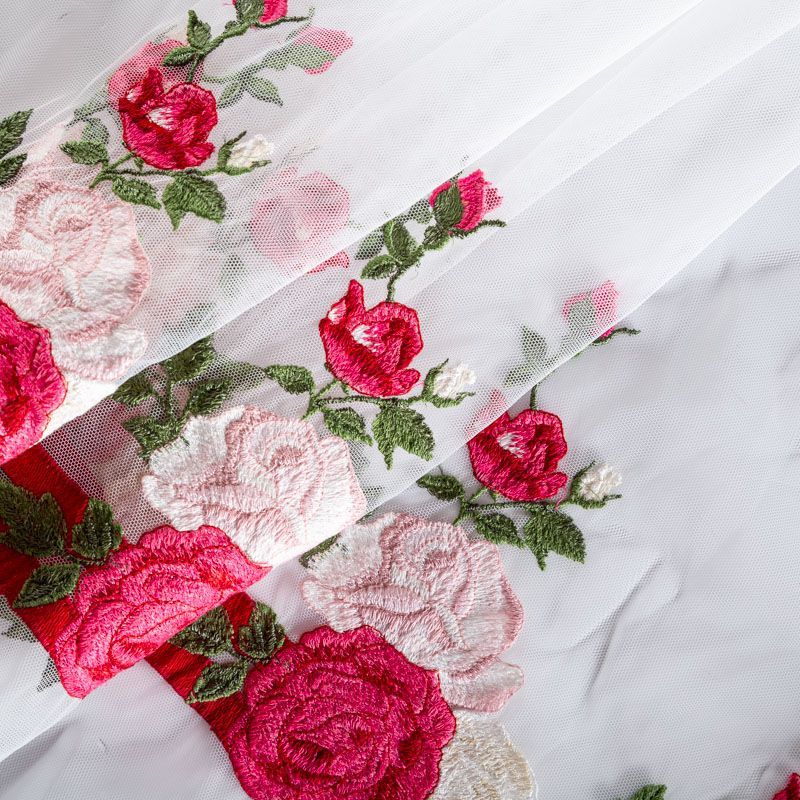 Вышивка на сетке Monnalisa высочайшего качества. Сетка молочного оттенка, мягкая, приятная на ощупь, отлично драпируется. Богатая объемная вышивка в виде красных и розовых цветов выполнена идеально. Подойдет как для самостоятельного изделия: юбка, ярусное платье, так и для декорирования любых изделий: вставка в рукав, оборка и т.д.