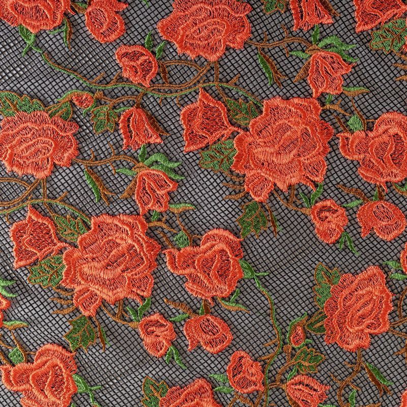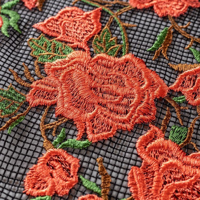 Шикарные красные розы вышитые на чёрной сетке. Сетка имеет среднюю ячейку, за счет структуры немного тянется. Прекрасно подойдёт для платьев, юбок, брюк, шорт, топов, комбинированных платьев или отделки моделей одежды как для особых случаев, так на отдыхе. Рекомендуется подклад.