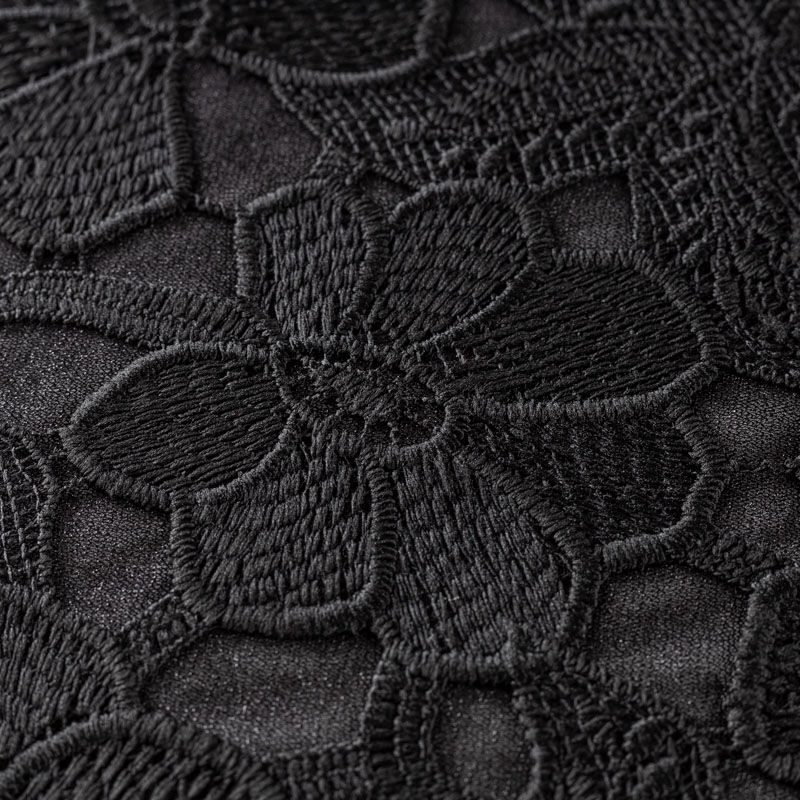 Очень эффектная вышивка на сетчатной основе черного цвета с мелкой ячейкой, мягкая и пластичная. Вышивка с цветочными мотивами в тон основе, плотная, расположена по всем полотну. Ткань приятная к телу, не колется, не цепляется. Идеальна для эффектных вечерних нарядов и для повседневного образа в виде платья-футляра, топа, блузки, летнего жакета, кардигана, брюк или шорт. Требуется подклад.