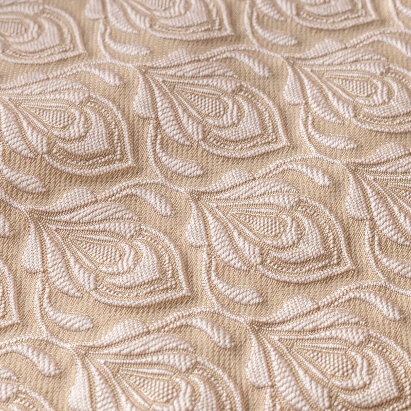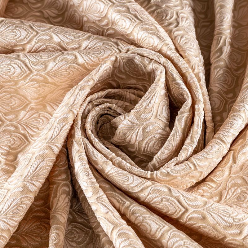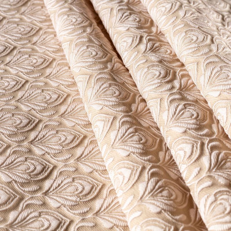 Благородный светло-бежевый фон итальянского жаккарда  дополнен объемным фантазийным узором жемчужно-молочного оттенка. Ткань легкая, средней плотности, не просвечивает, не тянется. Хорошо держит форму и драпируется. Идеально подойдет для платьев различных силуэтов, костюмов, жакетов, юбок, шорт, легких пальто.