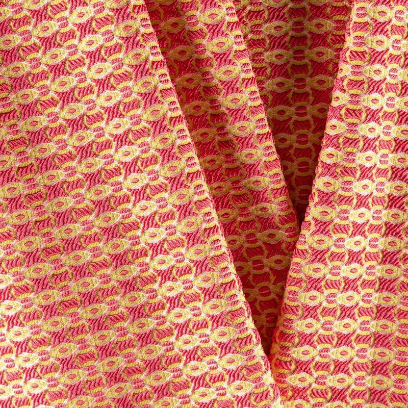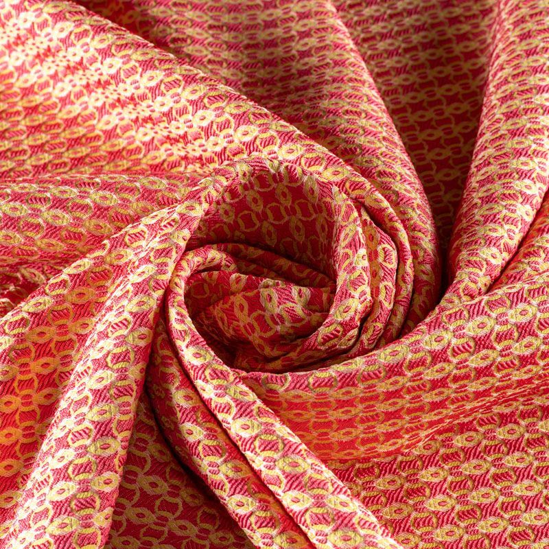 Мягкий жаккард в ярком коралловом оттенке с мелким абстрактным узором желтого цвета. Ткань пластичная, непрозрачная, поверхность фактурная в рубчик, приятная на ощупь, тянется, немного держит форму, хорошо драпируется красивыми складками. Будет комфортна для пошива костюма, женственного платья, юбки, брюк, легкого пальто, мягкого бомбера.